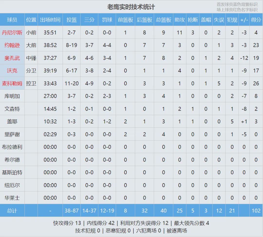 最后来看看本场数据,你觉得老鹰有机会赢下系列赛吗?