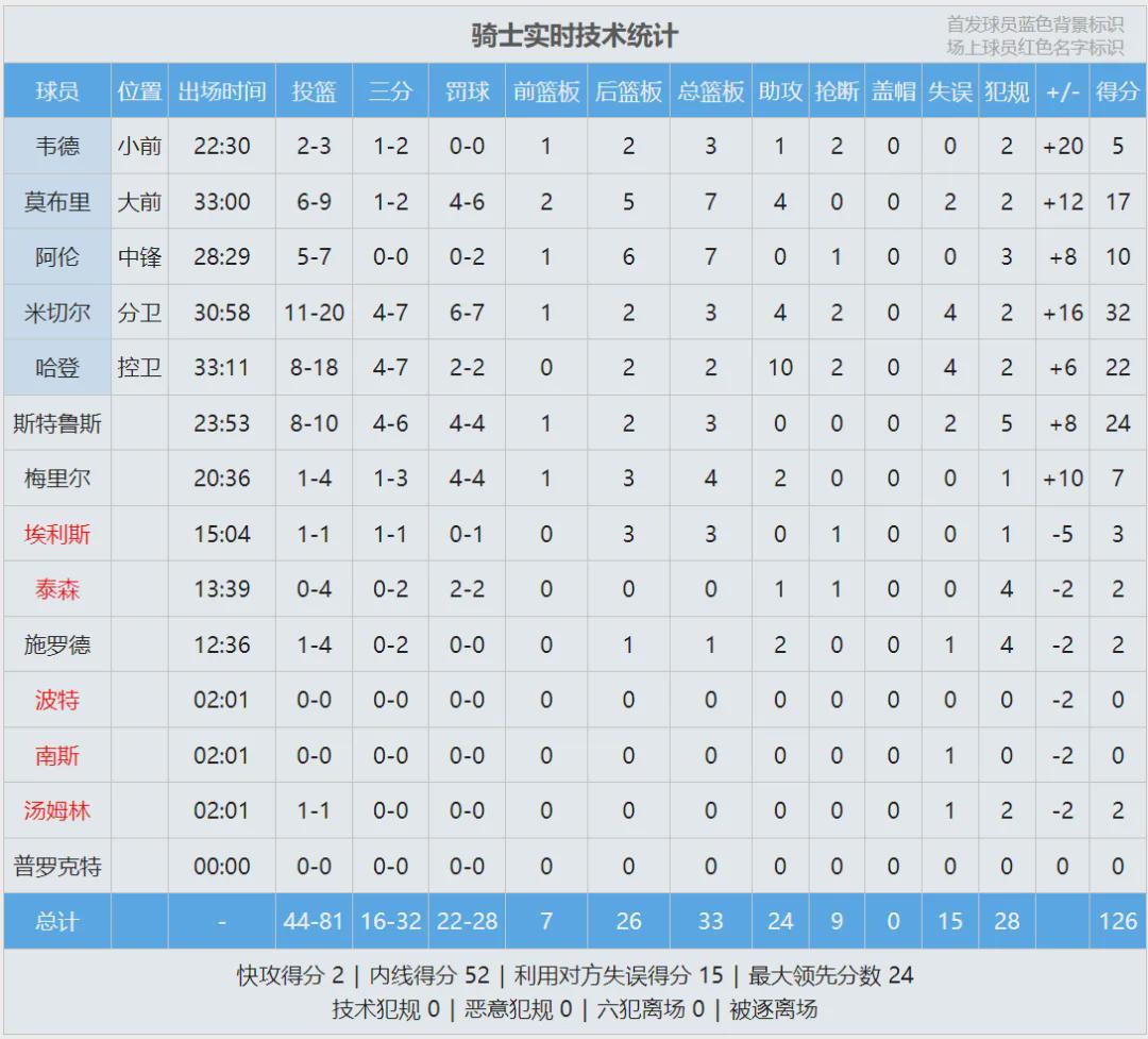 先看骑士和猛龙这一场,四节比分(猛龙在前):31-35、23-26、22-36、37-29,骑士最多领先24分,比赛早早失去悬念。斯特鲁斯10投8中砍下24分3板,哈登18中8得到22分2板10助2断。巴雷特24分2板3助、巴恩斯21分7助。