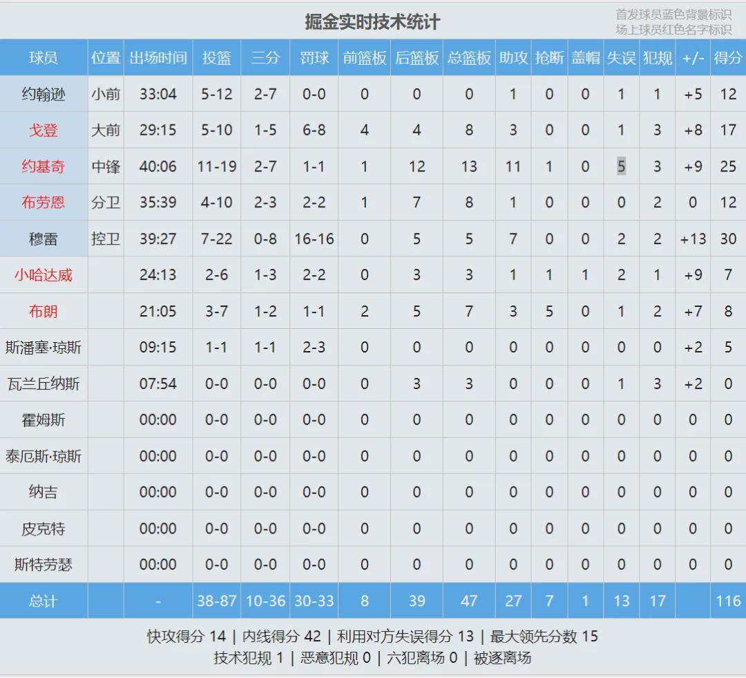 接下来看看掘金和森林狼这场,四节比分(森林狼在前):33-23、29-39、17-29、26-25。上半场两队战平,掘金第三节一波流拉开。森林狼防守动作比较大,导致犯规过多。赛后森林狼主帅批评穆雷夸张表演,骗得16次罚球。