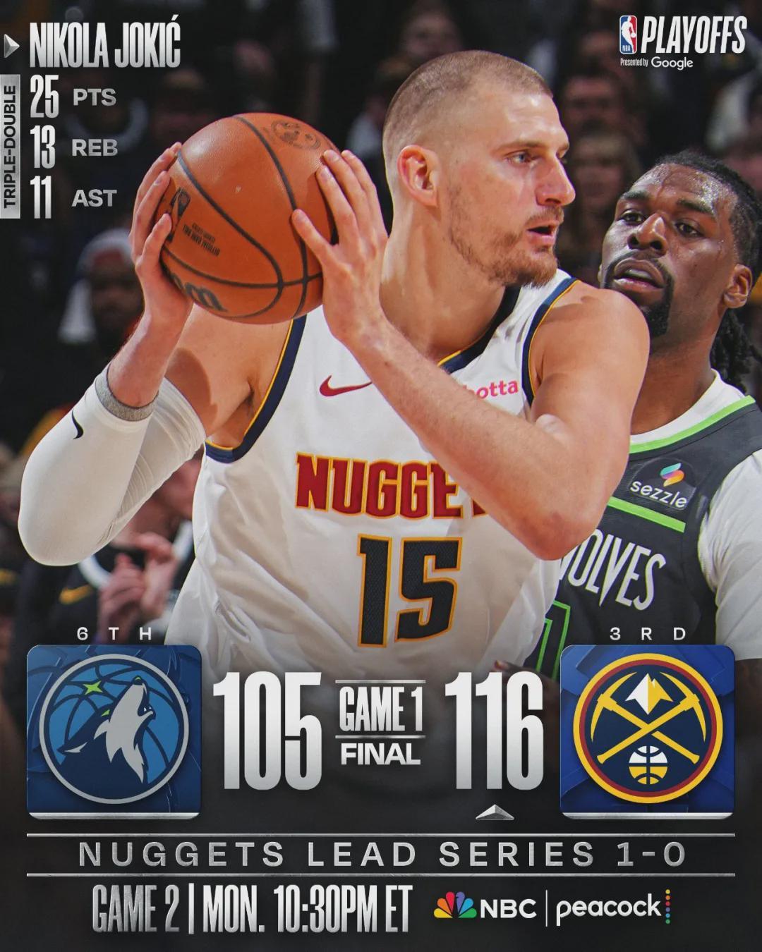 两队外线都不准,掘金三分36中10,森林狼34中11。约基奇投篮19中11,三分7中2,罚球1中1,得到25分13篮板11助攻5失误。这是约老师季后赛生涯第22次三双,位列季后赛历史第三,仅次于魔术师(30)和詹姆斯(28)。