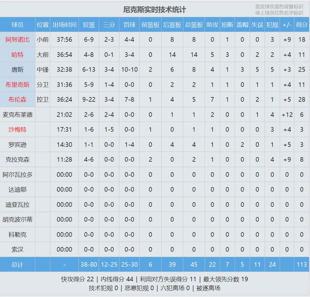 最后看看尼克斯和老鹰这一场,四节比分(老鹰在前):24-30、31-27、19-26、28-30。布伦森首节11中8爆砍19分,后三节11中1依靠罚球拿到9分。唐斯的表现正好相反,上半场6中1仅得6分4失误,下半场7中5砍下19分1失误。