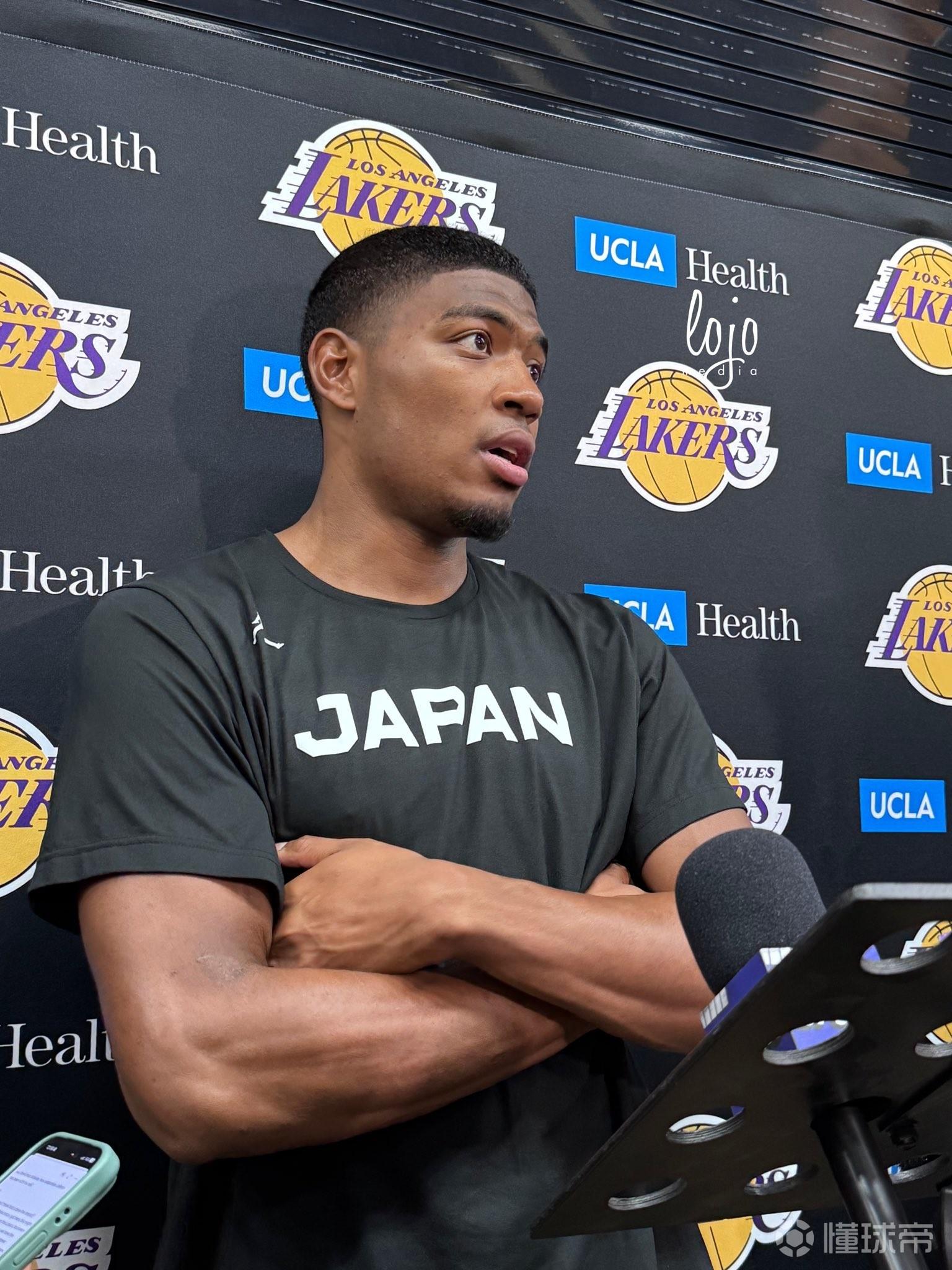 近日,湖人正在备战季后赛,洛杉矶当地记者LoJo Media在湖人训练日前往湖人训练场地,据报道,八村在接受媒体采访时,身着日本国家队训练短袖。