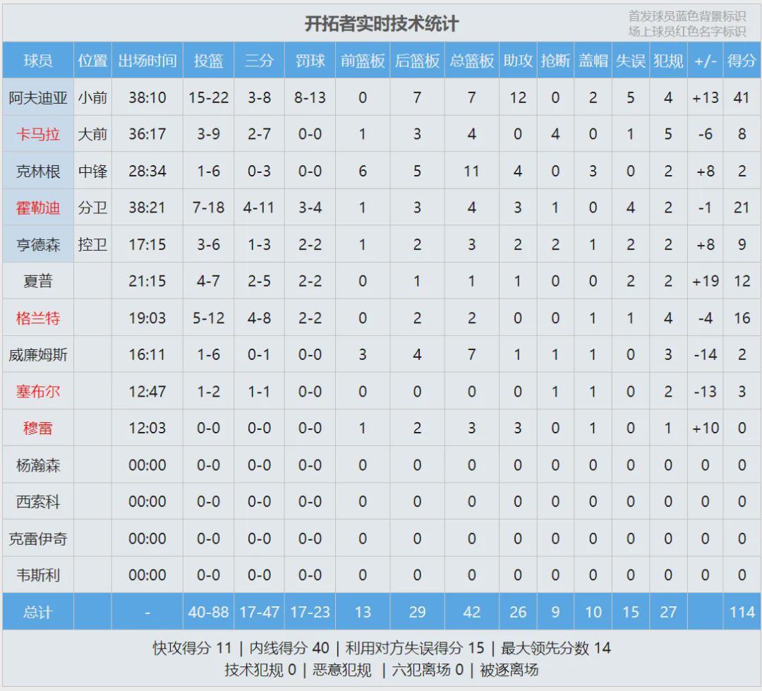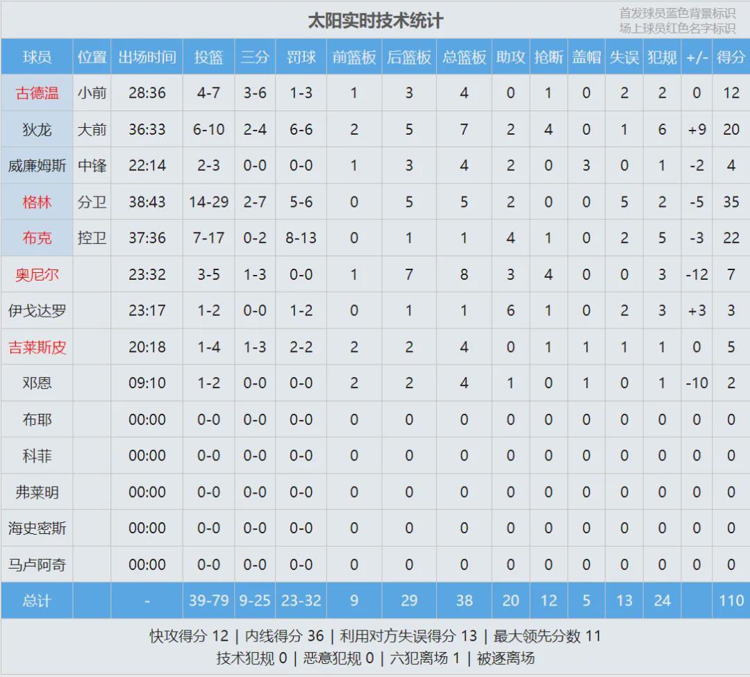 开拓者迅速推到前场,格兰特又扣了一个。全场结束,开拓者114-110险胜太阳。阿夫迪亚41分7板12助2帽、霍勒迪21分4板3助、格兰特16分、卡马拉8分4板4断;杰伦-格林35分5板2助、布克22分4助、狄龙20分7板2助4断。