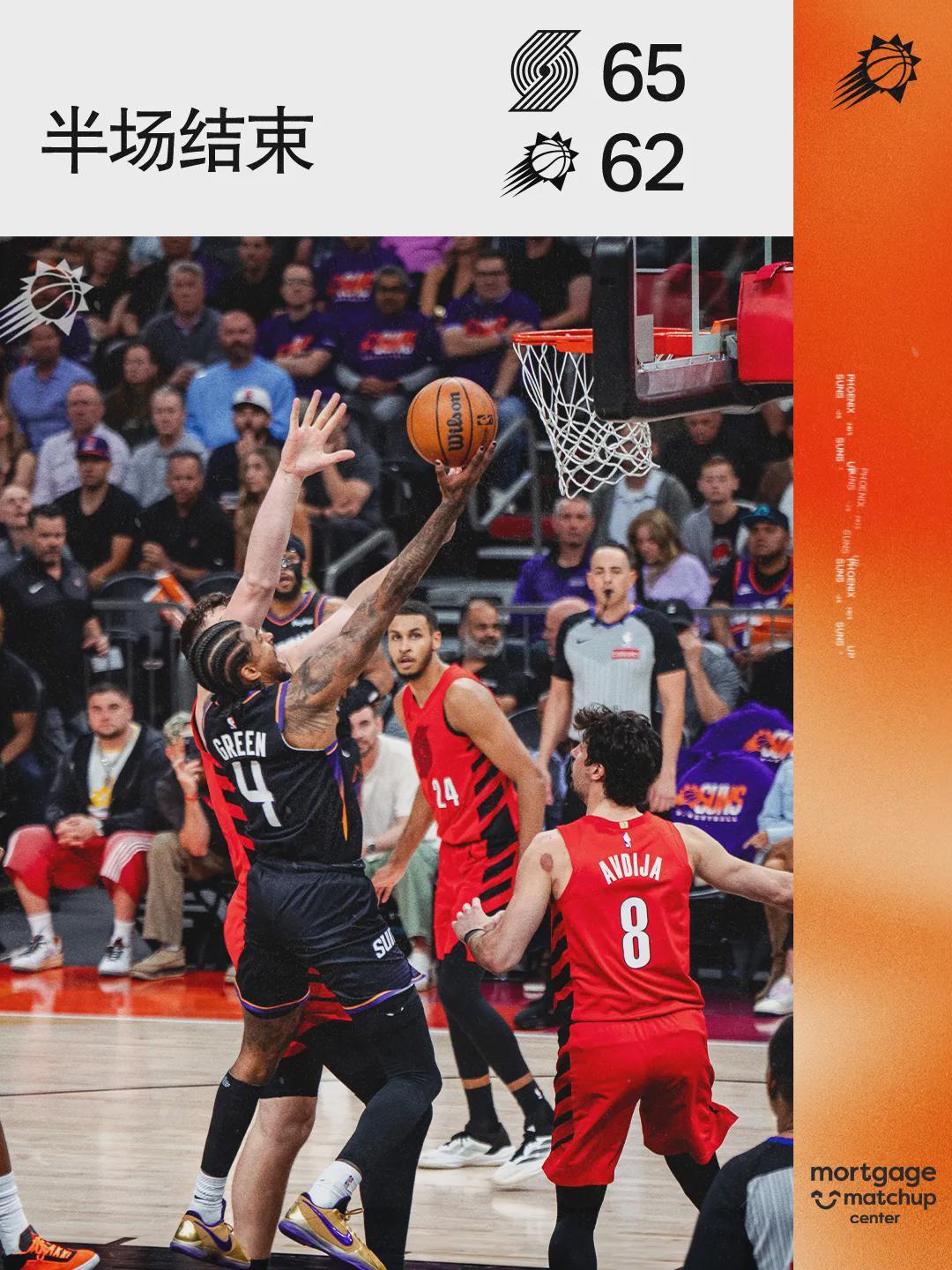 半场战罢,开拓者65-62反超太阳,阿夫迪亚11中7得到16分7助。杰伦-格林14中8,高效率砍下22分2篮板1助攻,布克10中6拿到16分3助攻。狄龙3中2,仅得7分3篮板2助攻。开拓者三分球27投12中,太阳三分球只有12中4。