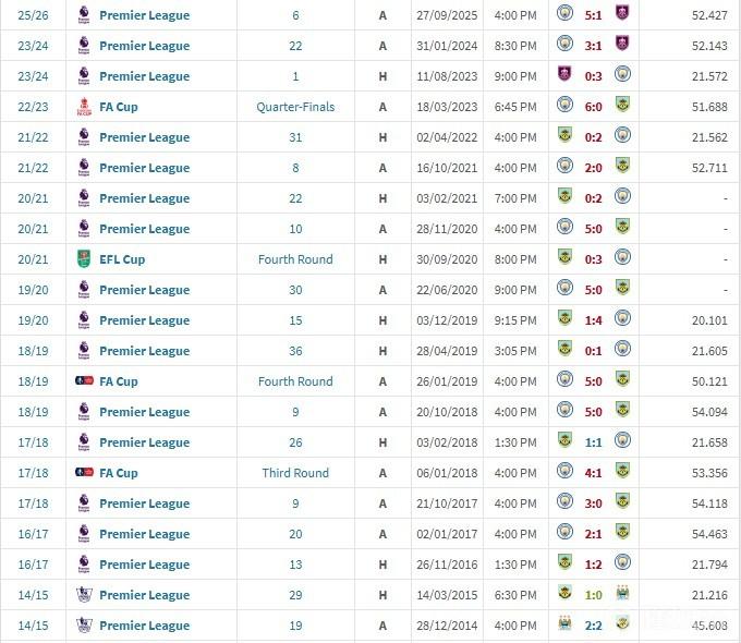 根据统计,曼城已经在对阵伯恩利的连续14场比赛取得胜利,上一次没能战胜伯恩利还是17-18赛季英超客场1-1战平对手,上一次输球是14-15赛季英超客场0-1被击败。