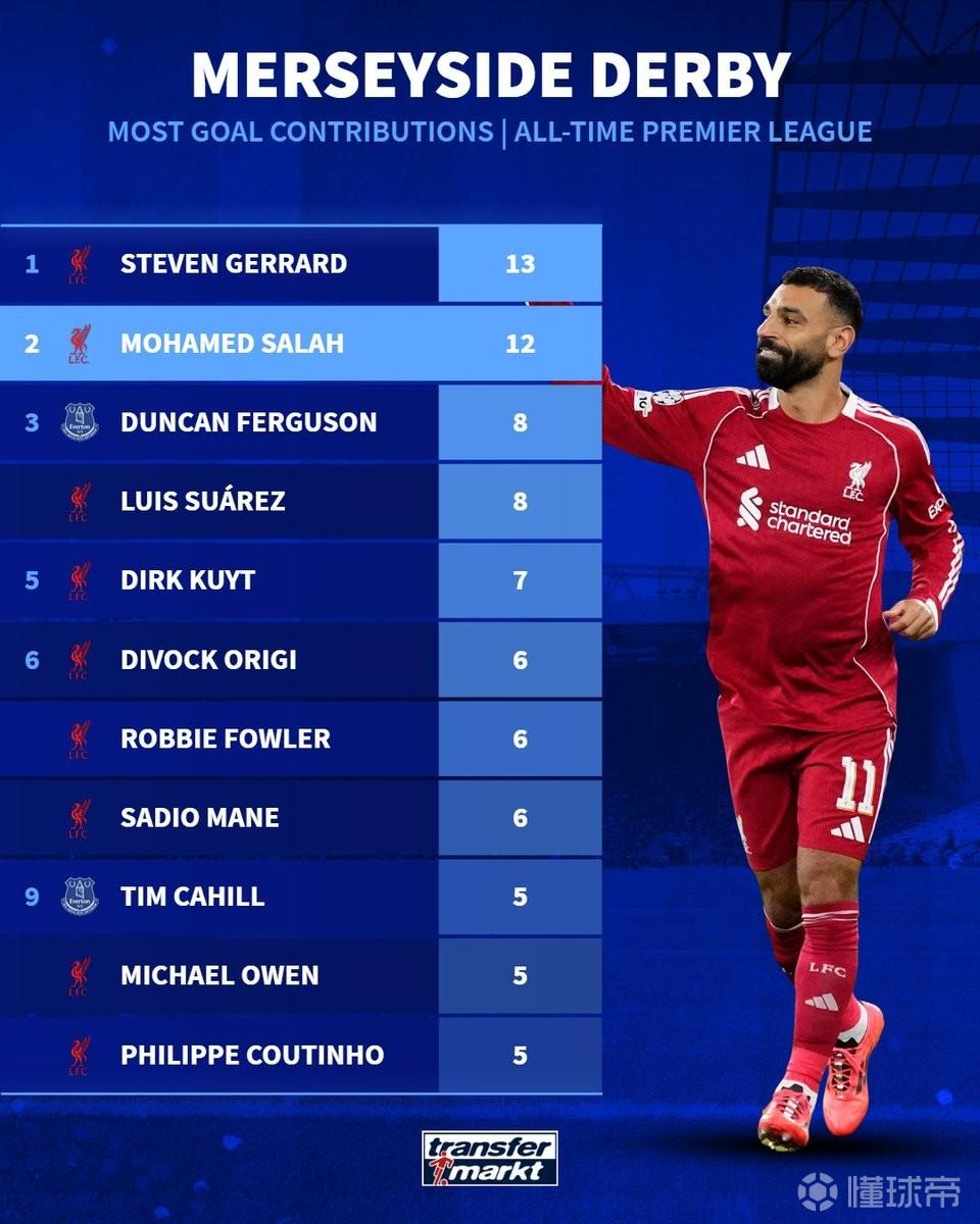 英超默西塞德德比直接参与进球前10:萨拉赫12球第2