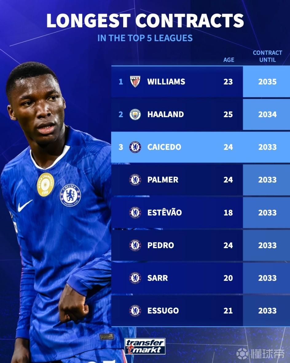 五大联赛最长合同榜:尼科-威廉斯、哈兰德前2,切尔西6人上榜