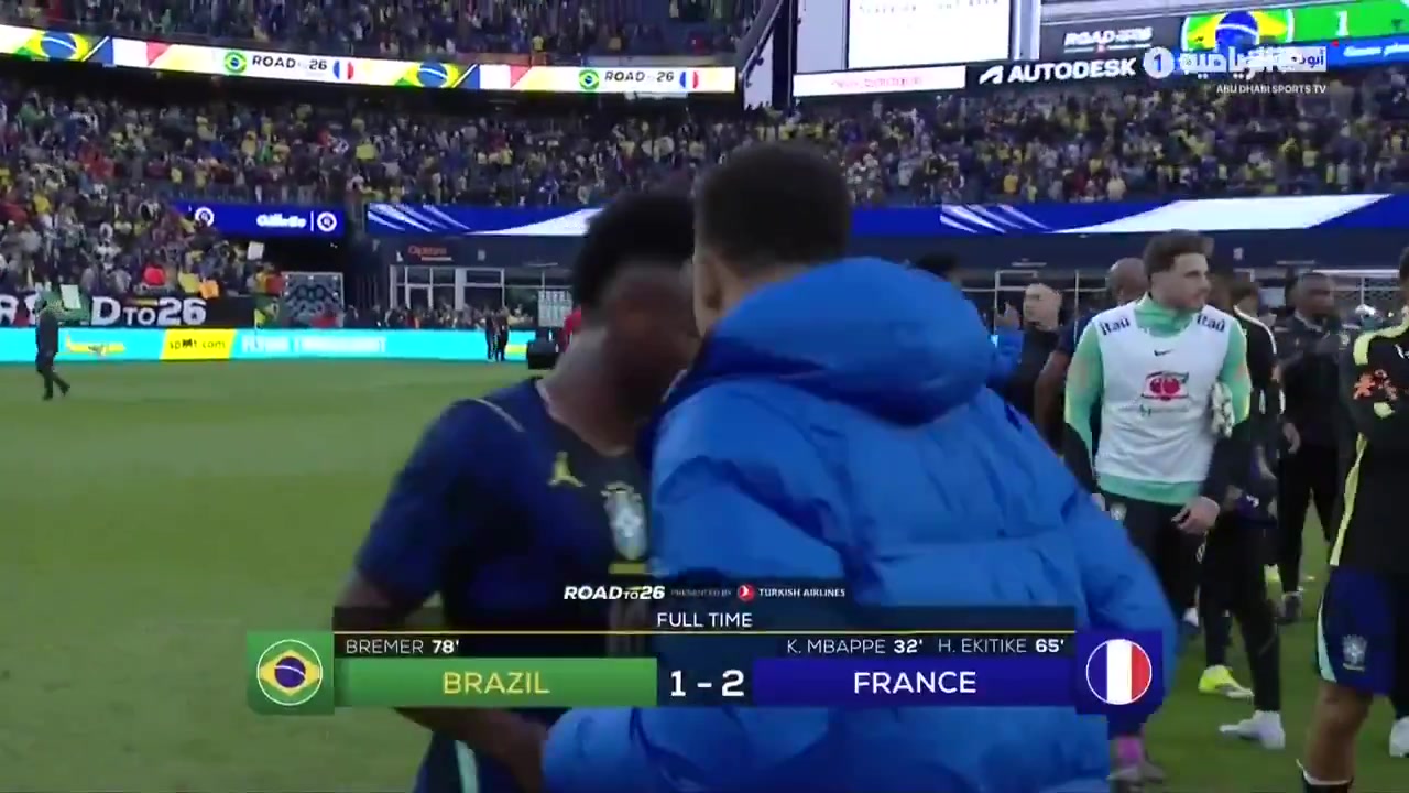 友谊赛法国2-1险胜巴西姆巴佩维尼修斯赛后互换球衣