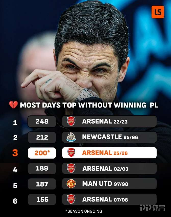 英超领跑天数最多却未能夺冠排行:阿森纳本季第3 第一也是枪手