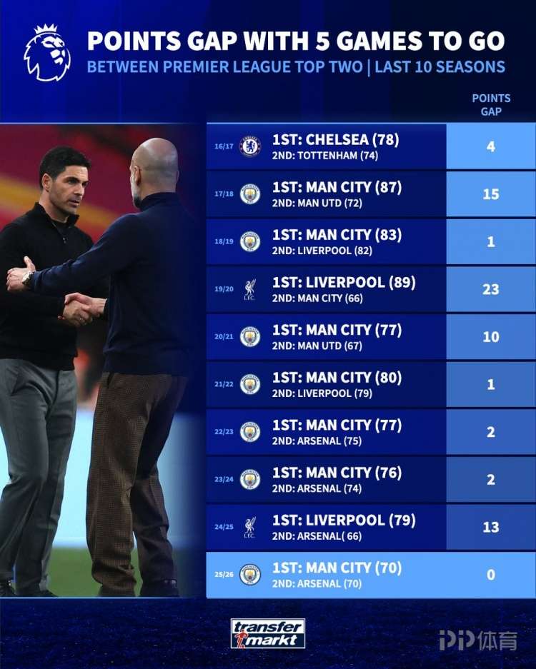 英超近十赛季同期榜首分差:本季0分最少 19-20赛季23分