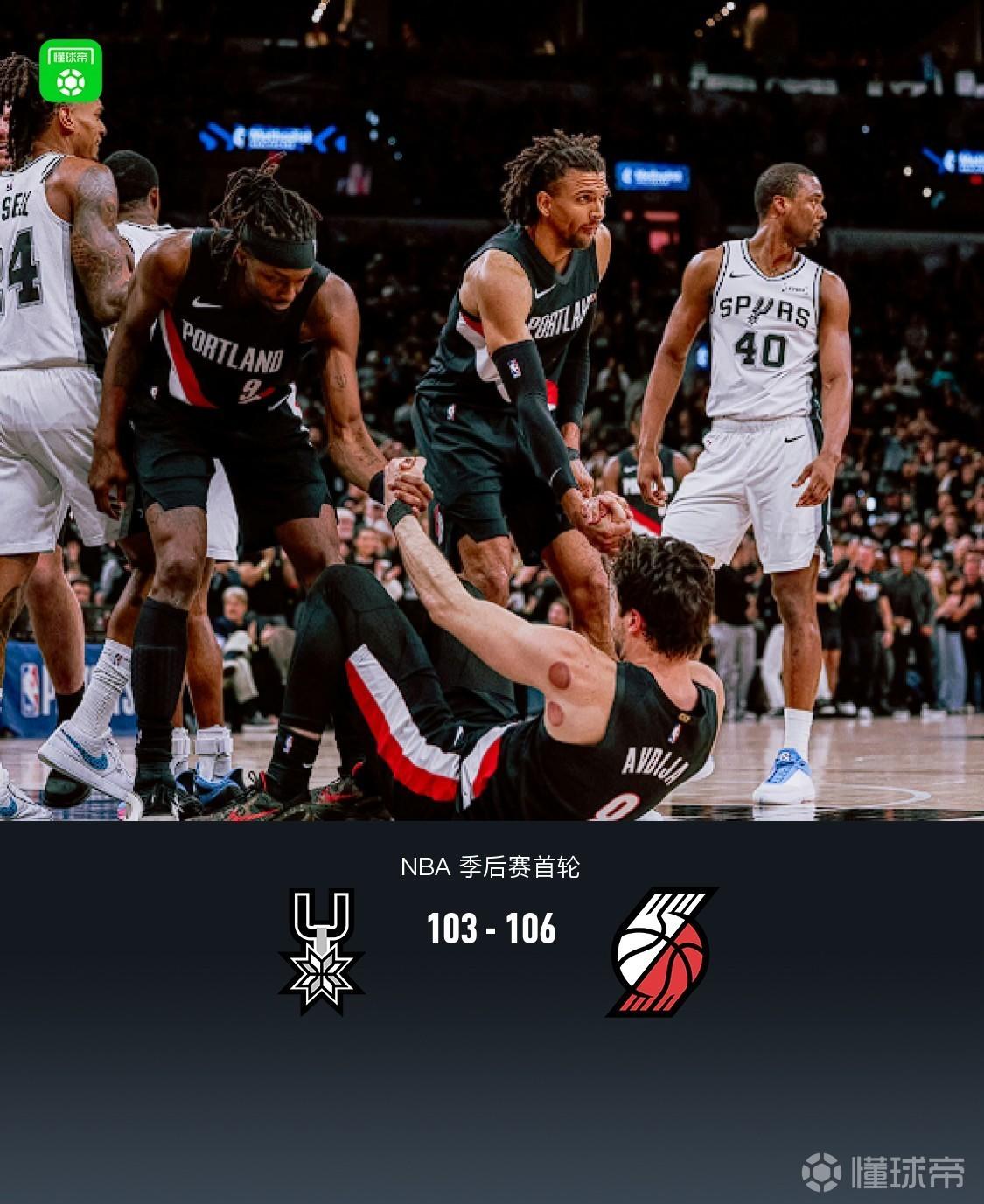 第四节,开节开拓者持续进攻哑火,马刺一波13-0直接拉大至14分,开拓者霍勒迪联手格兰特、卡马拉一波11-2追至5分,马刺凯尔登三分稳住局面,随后开拓者亨德森、卡马拉相继得分再度追至4分,马刺进攻连续不中,开拓者亨德森、霍勒迪相继得分直接反超1分,马刺继续进攻不中,开拓者罗威空接2+1可惜加罚不中领先3分,开拓者提前对马刺犯规战术,马刺瓦塞尔两罚全中,回来开拓者卡马拉两罚全中继续领先3分,最后一攻马刺瓦塞尔三分不中,全场结束,开拓者106-103马刺。
