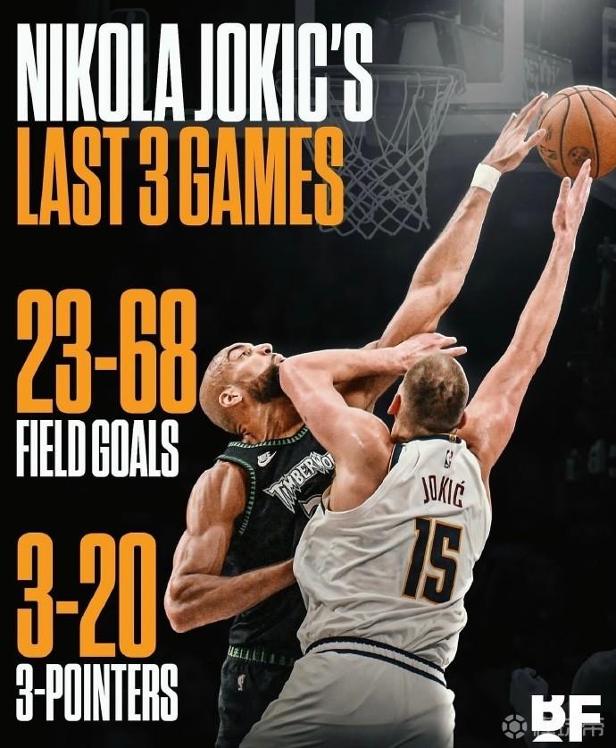 据统计,过去3场季后赛的约基奇68投23中,命中率33.8%,三分球20中3命中率低至15%。