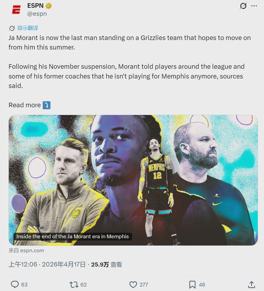 北京时间4月17日,据ESPN记者Tim MacMahon和Michael C. Wright联合报道,莫兰特告诉联盟里的球员们和教练,他不会再为灰熊打球了!莫兰特到现在还未走出赛季初期被灰熊禁赛的阴影,莫兰特感觉自己在灰熊被全队孤立了。