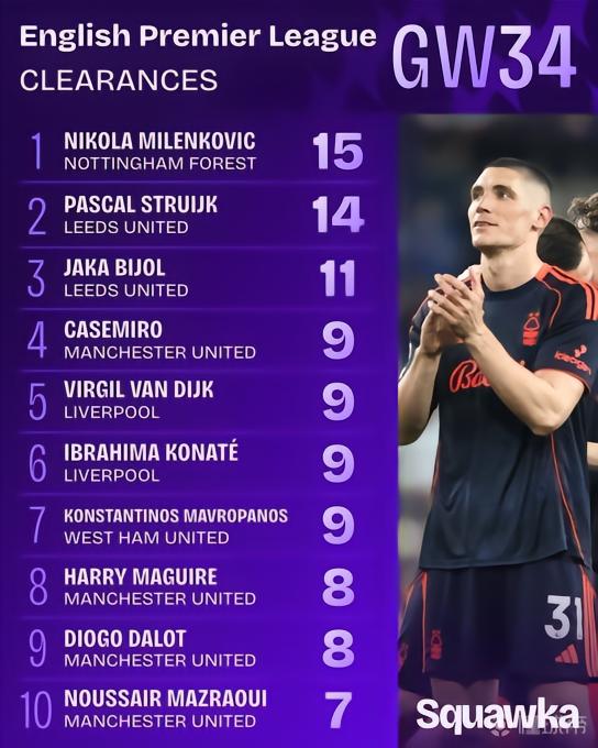 英超第34轮解围榜:米伦科维奇15次居首;曼联共4人上榜 PP体育,全天24小时在线直播国内外各大体育赛事,英超直播,西甲,德甲直播,亚冠,欧冠,欧联杯,CBA,篮球直播,WWE直播,PP体育,PP视频一起玩出精彩